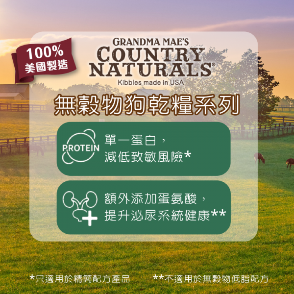• 以優質鴨肉為單一肉類蛋白質來源,不含穀物,減低食材致敏機會
