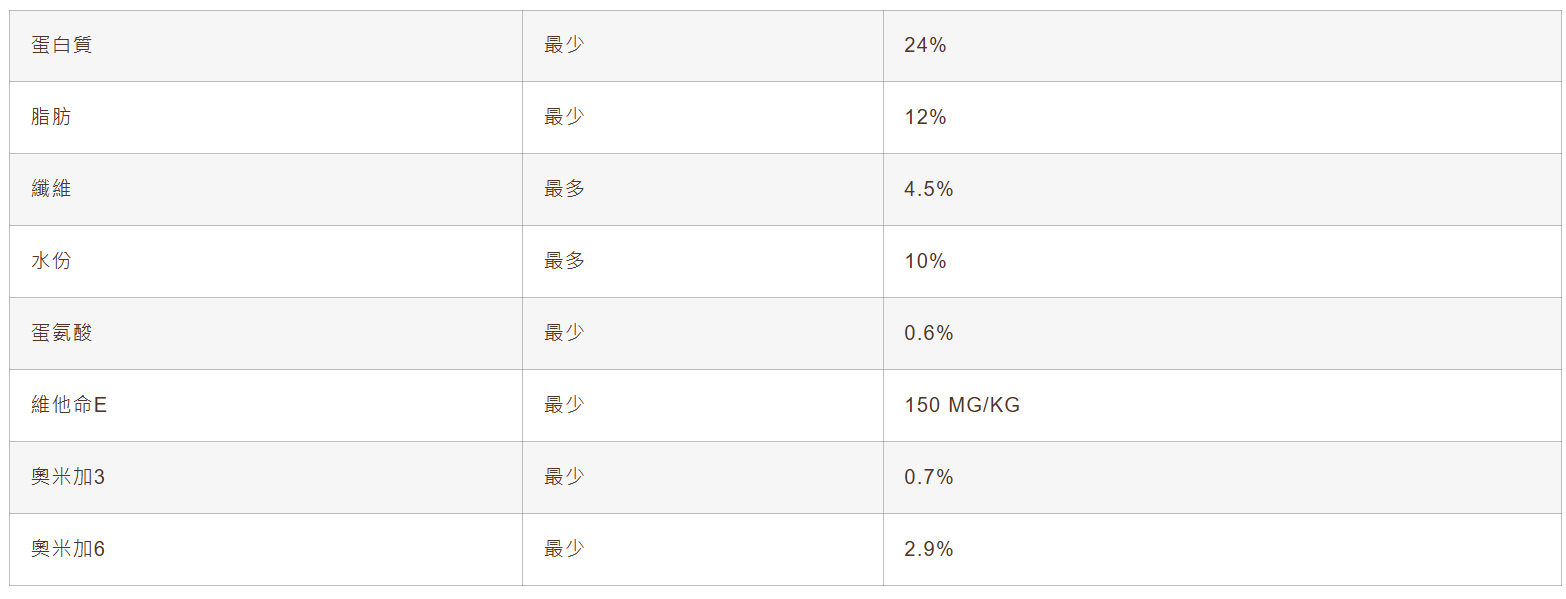 • 加入亞麻籽及魚油,含豐富奧米加3及6,令狗隻皮毛更光滑亮澤,並具抗炎效果,有助紓緩皮膚過敏及炎症