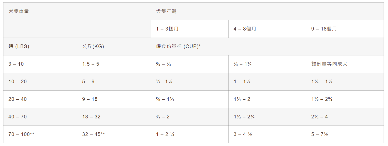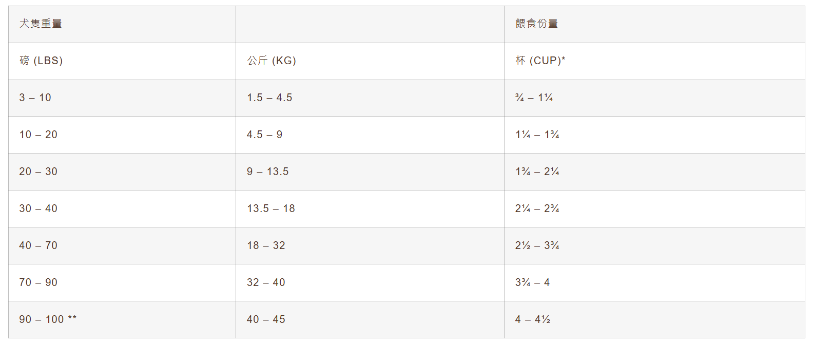 **100磅/45公斤以上犬隻,體重每增加10磅/4.5公斤,可增加¼杯餵食份量