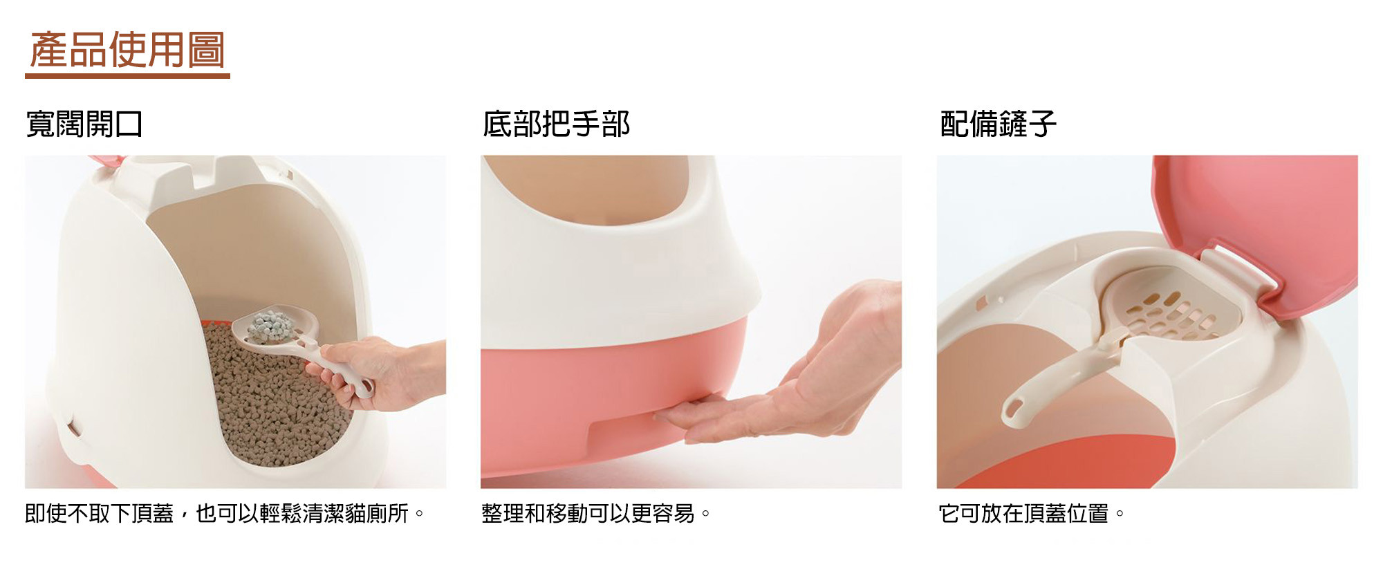 它是一種帶罩的型狀,防止貓沙飛濺。