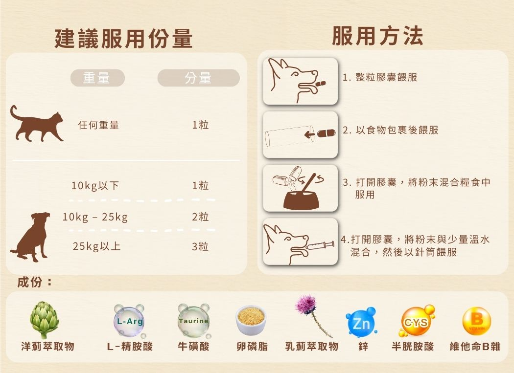 為了更有效地幫助貓貓以及狗狗護肝,配方亦額外加入多種有利肝臟健康的營養素,包括L-精胺酸、牛磺酸、卵磷脂、鋅、半胱胺酸及維他命B群,有助提升肝臟的解毒能力、改善肝功能,全面地幫助狗狗及貓貓護肝,並有助預防不同的貓肝病或者是狗肝病出現。