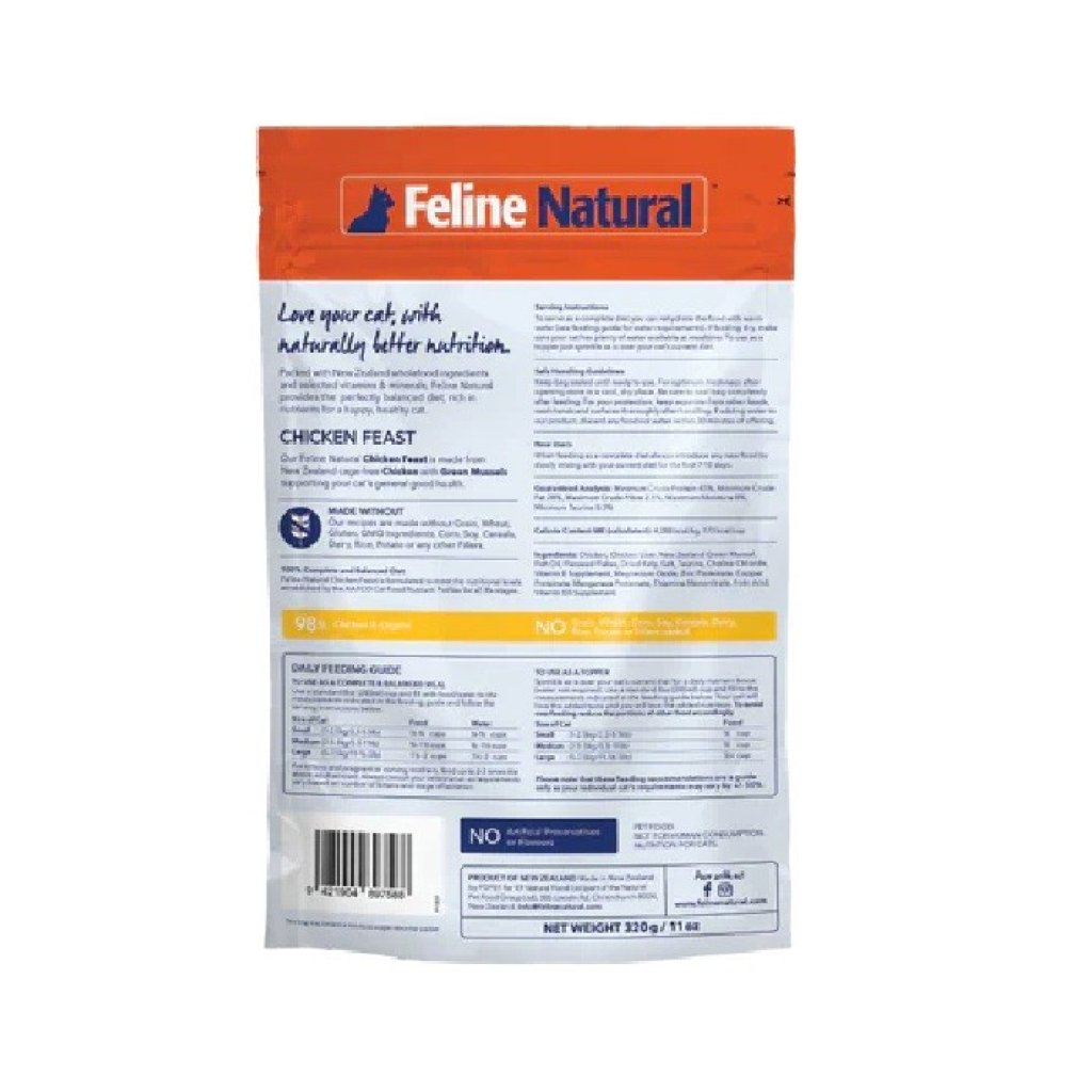 Feline Natural 無穀物凍乾貓糧 - 牛肉鱈魚盛宴為全方位均衡配方,含有98% 草飼牛肉及內臟﹑野生捕撈鱈魚﹑紐西蘭青口﹑亞麻籽片、天然油脂、海帶、維他命、礦物質與牛磺酸,為貓貓的健康提供全面支持。