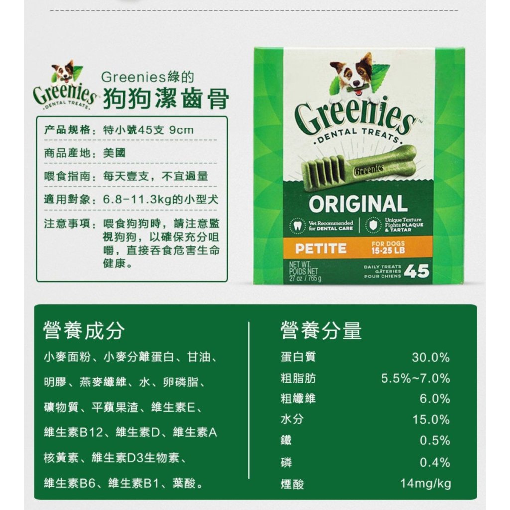 Greenies是美味、營養的咀嚼物,它有助於狗兒的健康,滿足狗兒天生喜愛咀嚼的需求。此產品的均質性與成分已顯示出它的確有助於減少臭味、控制齒垢(或牙結石),並強化牙齦和抑制口腔細菌滋生。當您的愛犬清潔它的牙齒時,也清新了它的口氣。