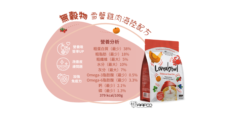 LOVEABOWL 雪蟹雞肉海陸配方符合美國飼料控制官員協會(AAFCO)所制定的貓糧營養配方設定,適合所有生命階段及成年貓維持所需營養水平。