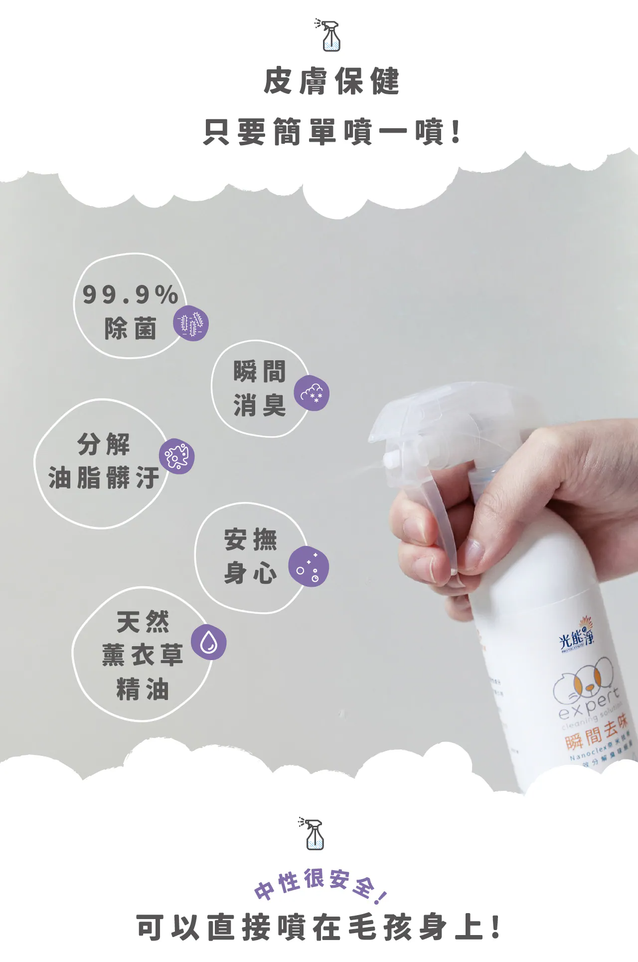 清潔脫臭、有效防護、中性溫和不刺激,可直接噴灑於寵物身上,