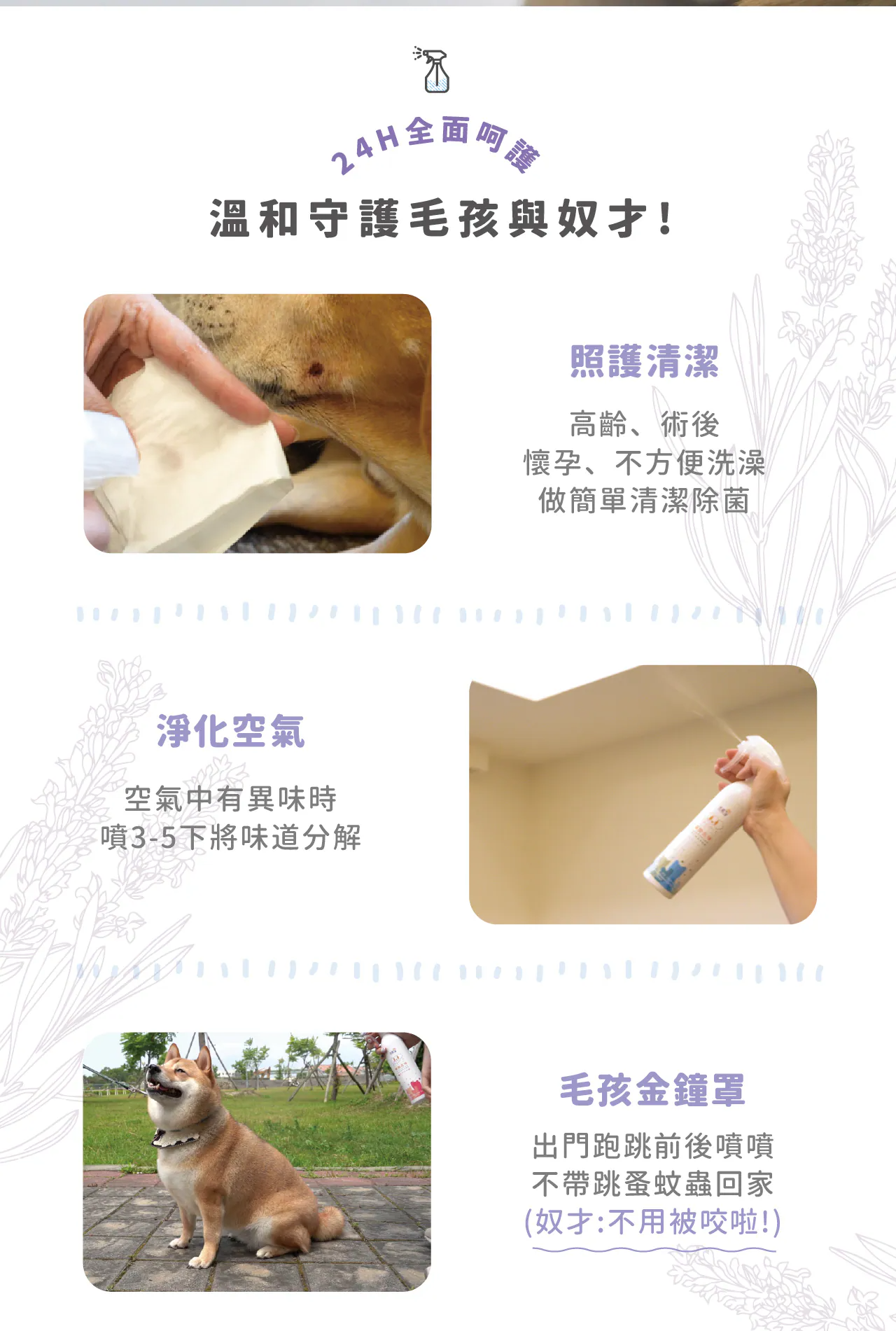 ►瞬間去味 ►外出防護(香茅除蚤、薰衣草驅蟲) ►可直接噴灑於寵物身上