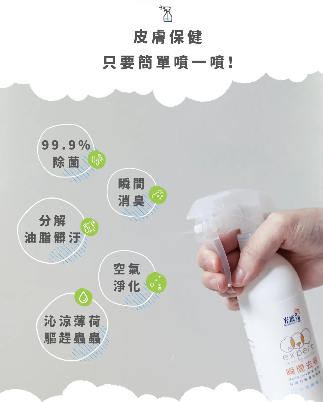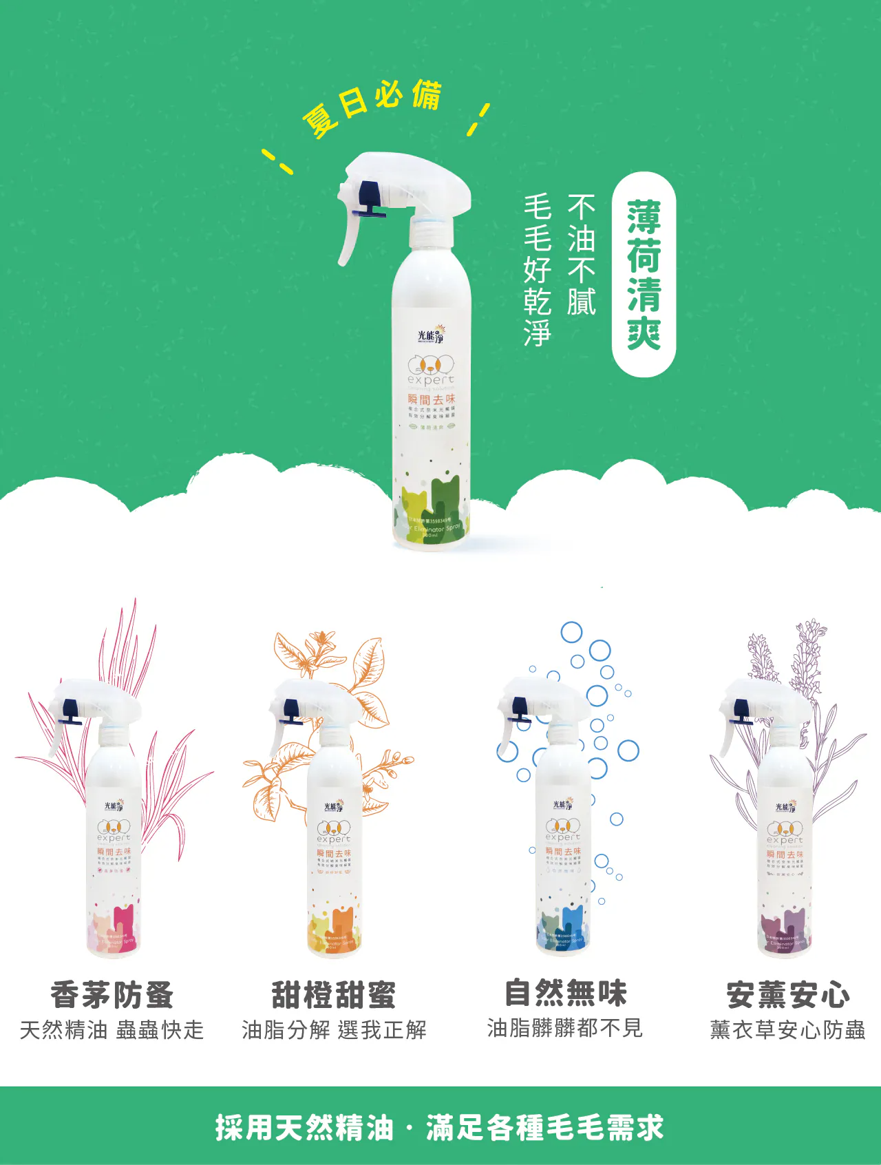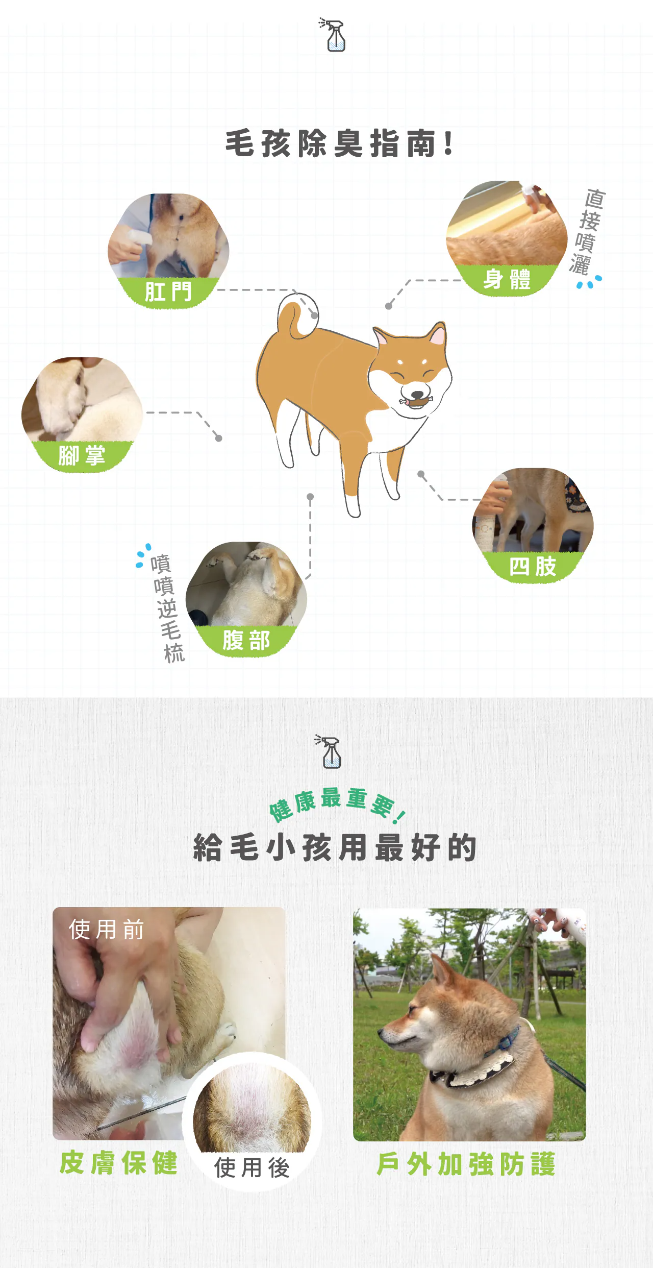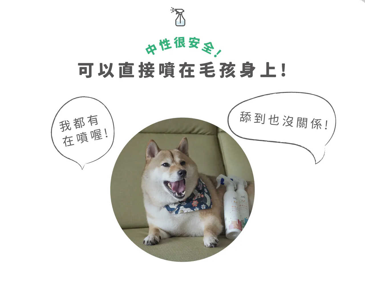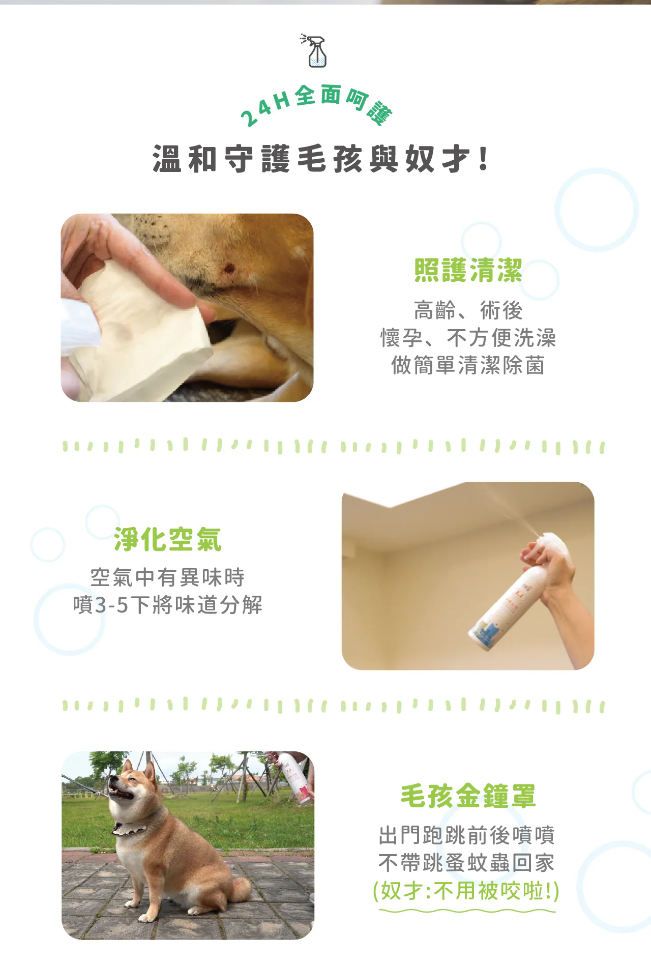 清潔脫臭、有效防護、中性溫和不刺激,可直接噴灑於寵物身上,