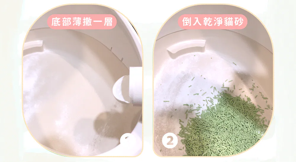 - 於貓砂空盆底層,少量均勻灑一層貓砂味立淨