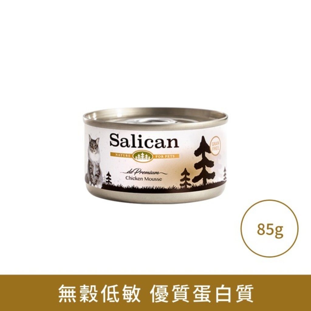 Salican 雞肉慕絲貓罐頭85G dePremium Chicken Series 精選鮮雞肉系列採用農場 飼養家禽,品質優良鮮美,提供豐富蛋白質、礦物質、維生素,配搭上等羊肉、鴨肉、 牛肉及海鮮。啖啖鮮肉配上熬製清湯, 有如新鮮現煮,鮮味濃郁,肉香極佳的 無谷低敏配方! Salican 森林罐全天然貓罐系列產品均採用 上等吞拿魚,鮮肉,海鮮等主要原料,提供 多樣不同特色的選擇,迎合不同貓咪需求,每款系列提供充足均衡營養,以優質天然食材製造,達至人類食用級數,絕不含人造色素、防腐劑、增味劑或任何化學物質。品質上乘,是貓咪吃得健康的好選擇。 每款系列更添加了貓咪不可或缺的牛磺酸、抗氧化的維生素E及均衡礦物質等,滿足每天營養需求。 成分: 水、鮮雞肉、雞油、葵花籽油、黃原膠、瓜爾膠、刺槐豆膠、卡拉膠、決明膠、維他命E、牛磺酸 建議餵飼分量(每日) : ‧ 每天餵食1-2罐,可加於乾糧中同時享用及請為愛貓準備清潔食水 ‧ 餵食量需視乎愛貓的體重、不同年齡階段、活動量等酌量調整 ‧ 室溫儲存,開罐後請放置在冰箱內並於48小時內食用