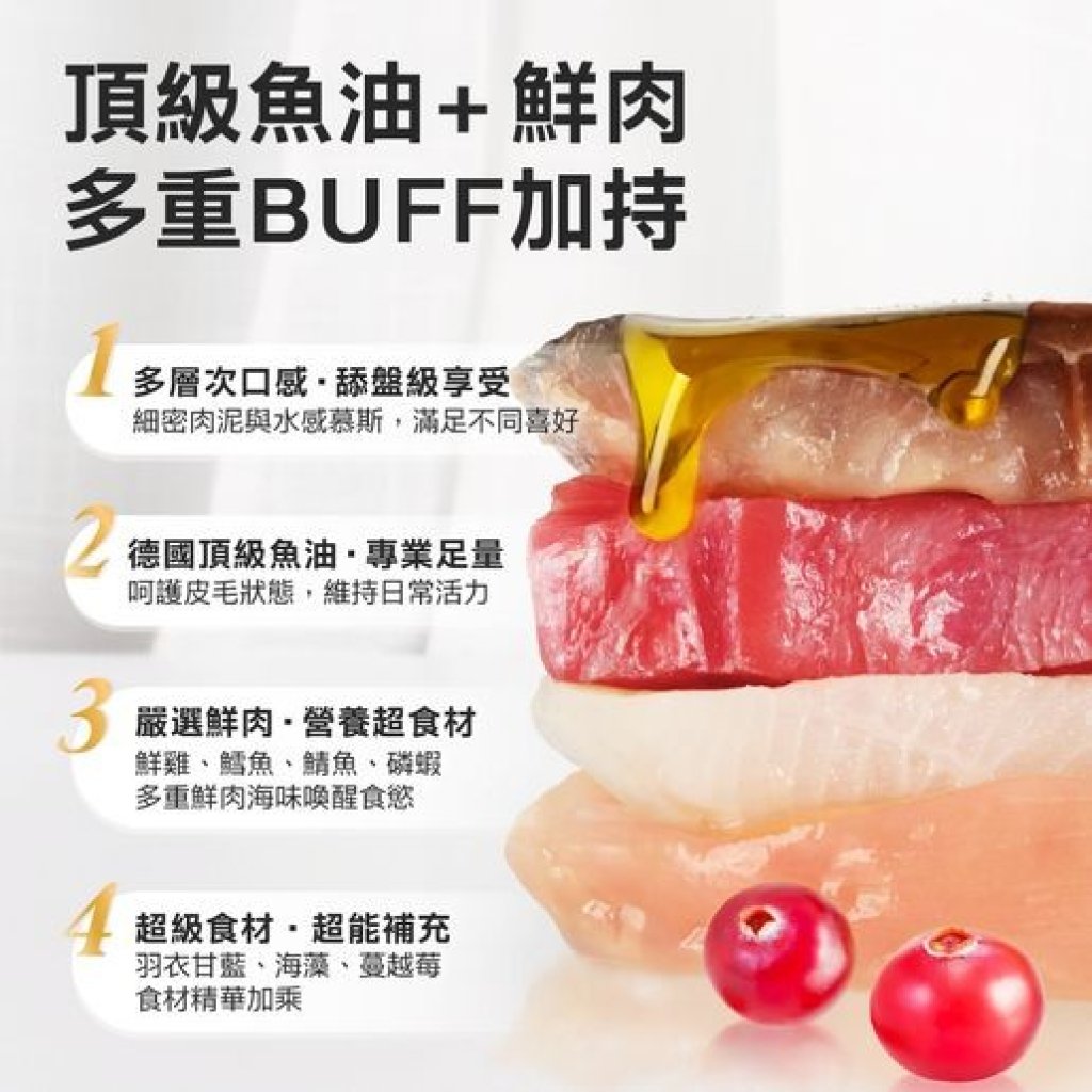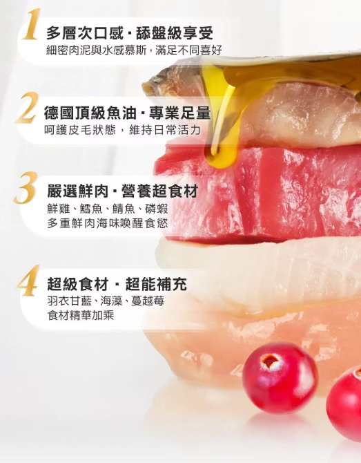 鰹魚、雞腿肉、磷蝦、魚油、洋車前子膳食纖維、羽衣甘藍、海藻、蔓越莓、卵磷脂、碳酸鈣、磷酸鈣、綜合維生素(A、B群、D、E)、綜合礦物質、牛磺酸