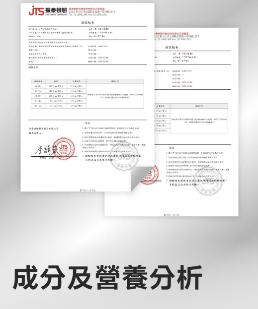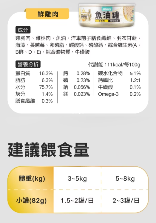 代謝能103kcal/100g、蛋白質16.8%、脂肪5.2%、水分76.3%、灰分1.4%、碳水化合物1%、纖維0.3%、鈣0.26%、磷0.21%、鎂0.021%、鈉0.052%、鈣磷比1.2:1、牛磺酸0.1%、Omega-3 0.2%
