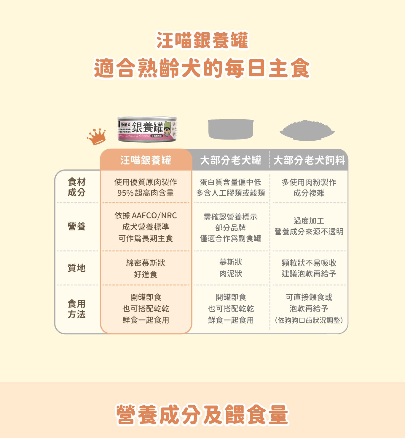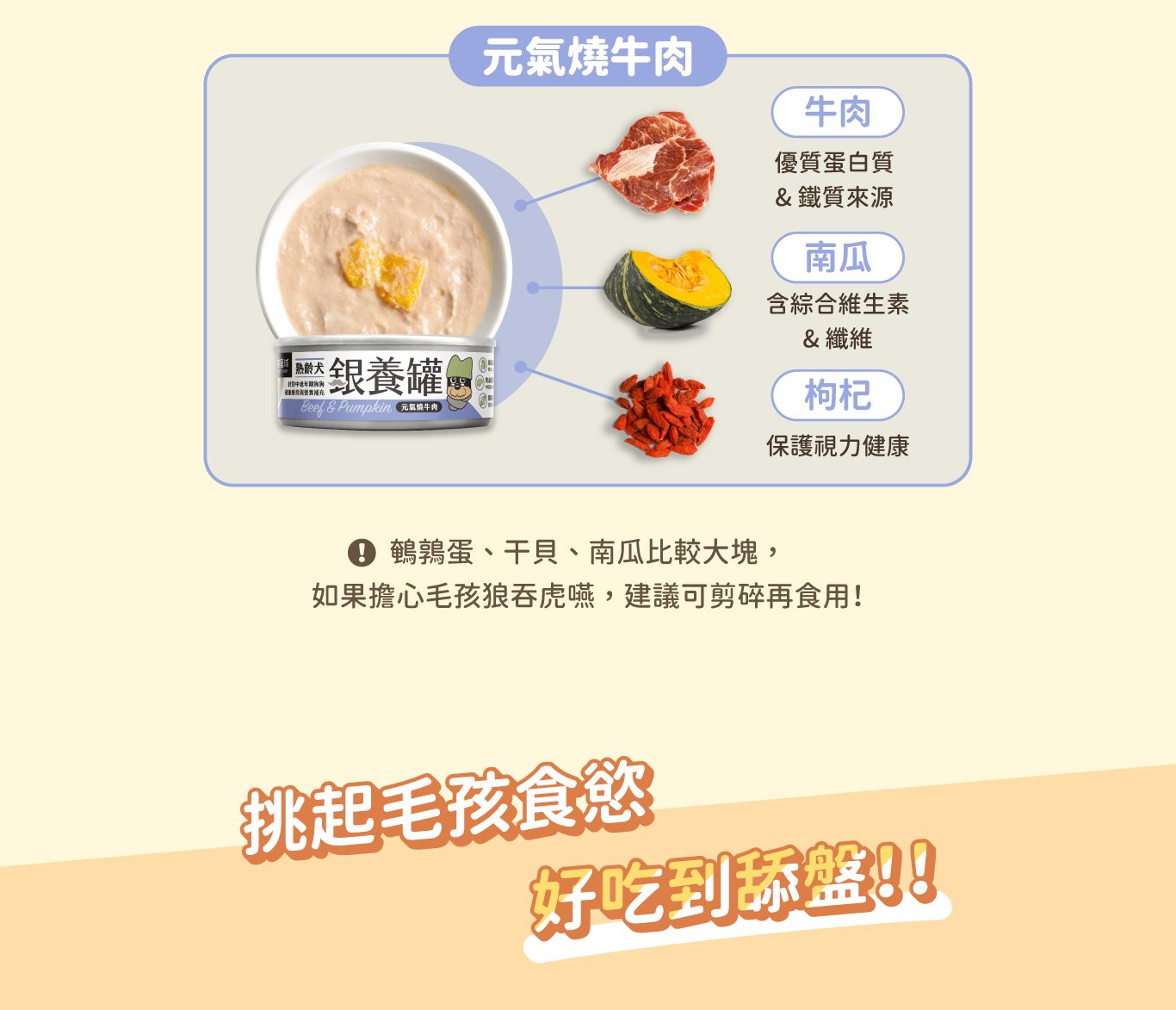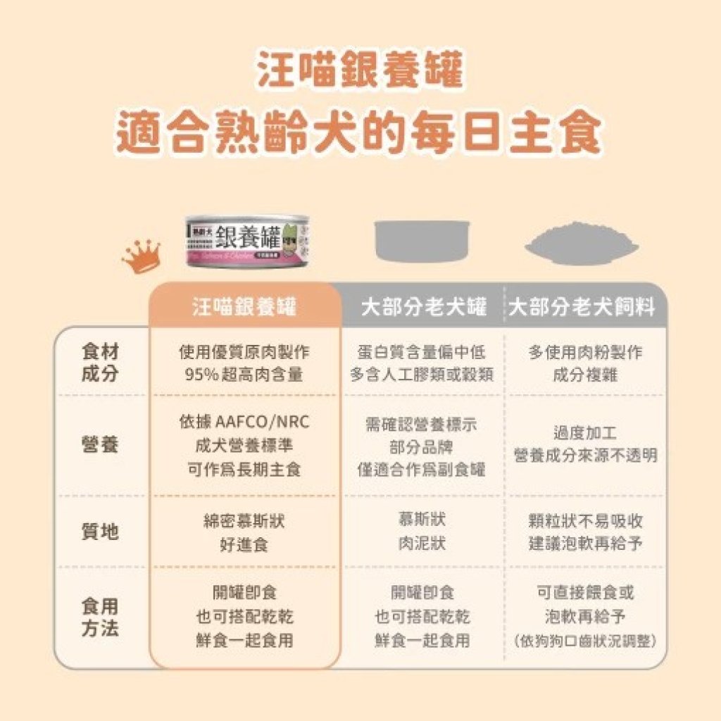 成年狗狗平常也可以吃熟齡犬銀養罐嗎?給老犬吃汪喵的銀養主食罐還需要搭配其他保健品嗎?狗狗牙齒咬不動飼料,但吃罐頭偶爾又會軟便怎麼辦?