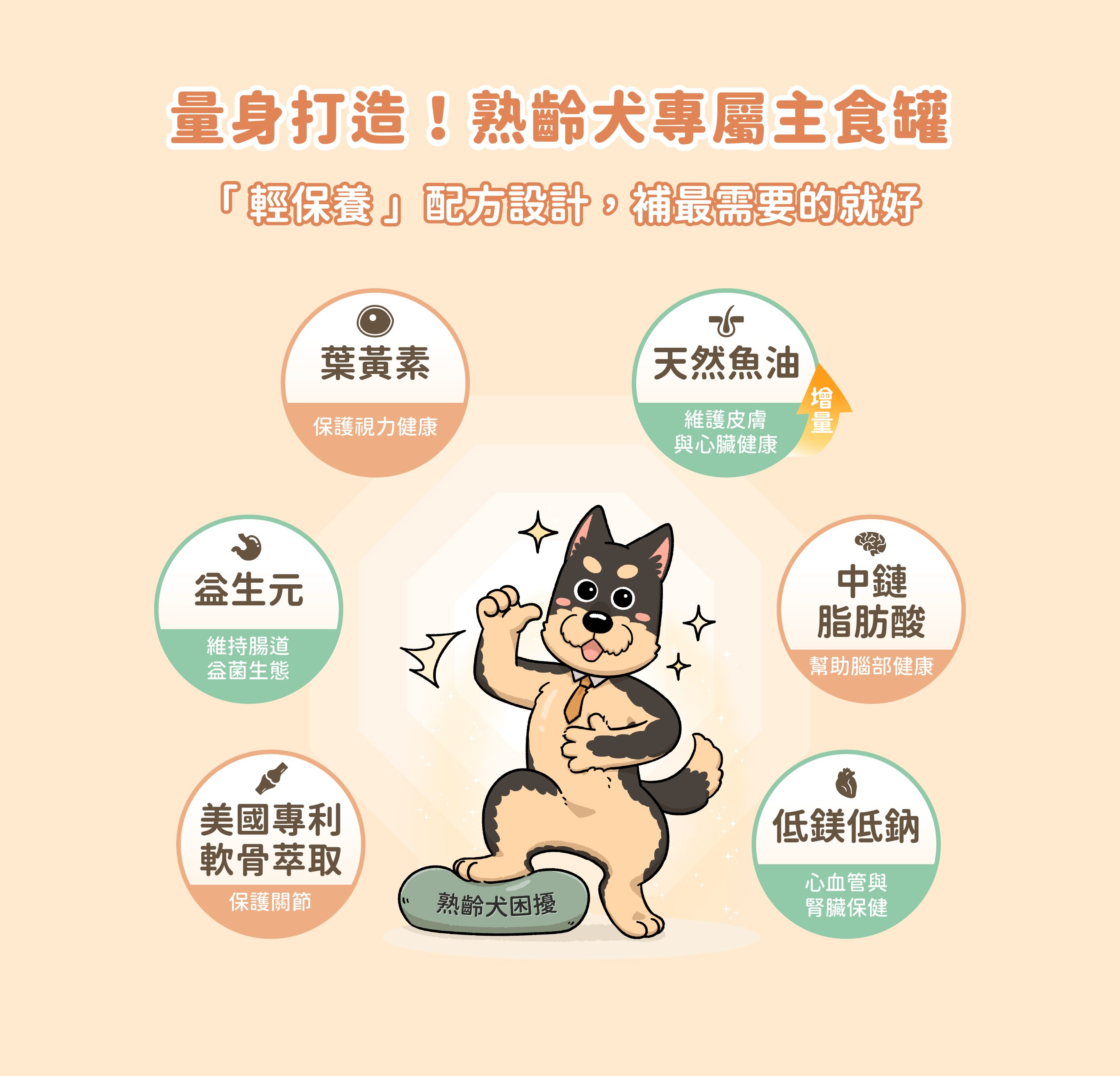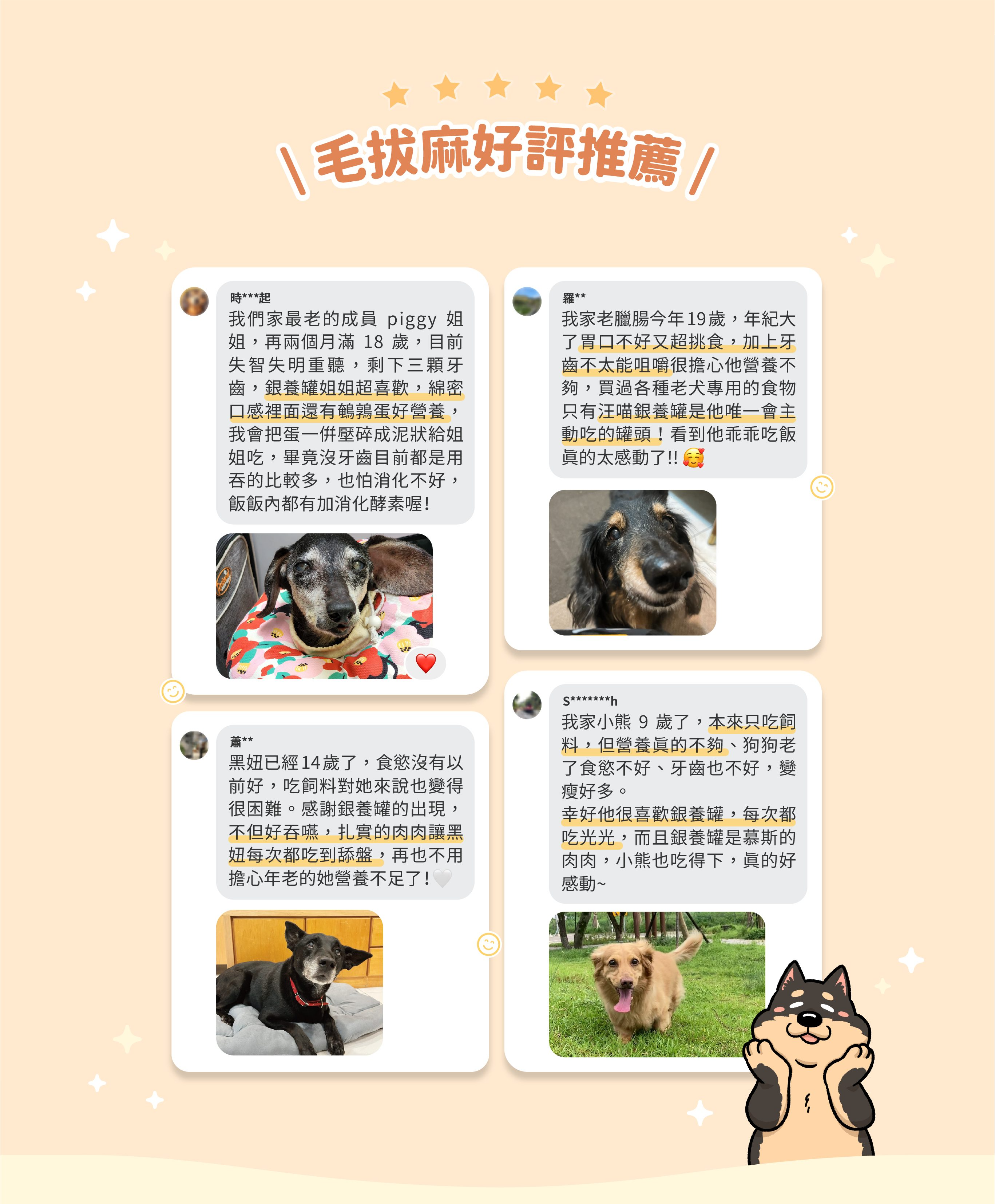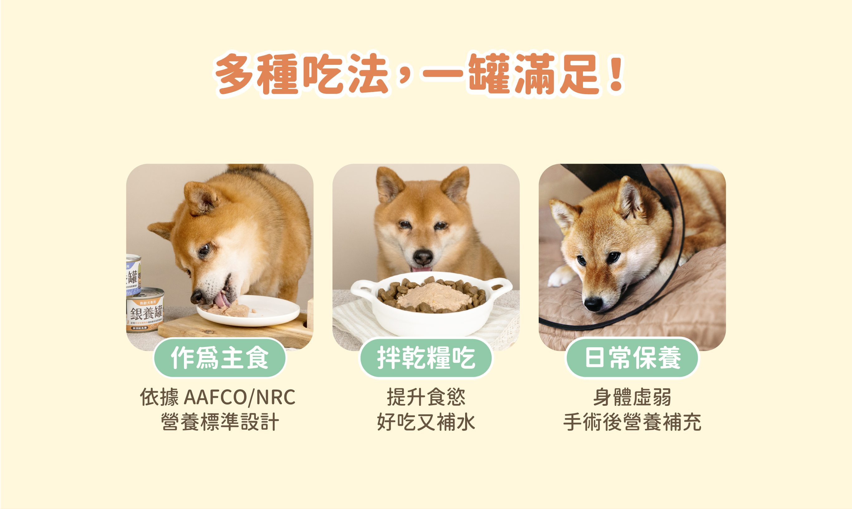 成年狗狗平常也可以吃熟齡犬銀養罐嗎?給老犬吃汪喵的銀養主食罐還需要搭配其他保健品嗎?狗狗牙齒咬不動飼料,但吃罐頭偶爾又會軟便怎麼辦?