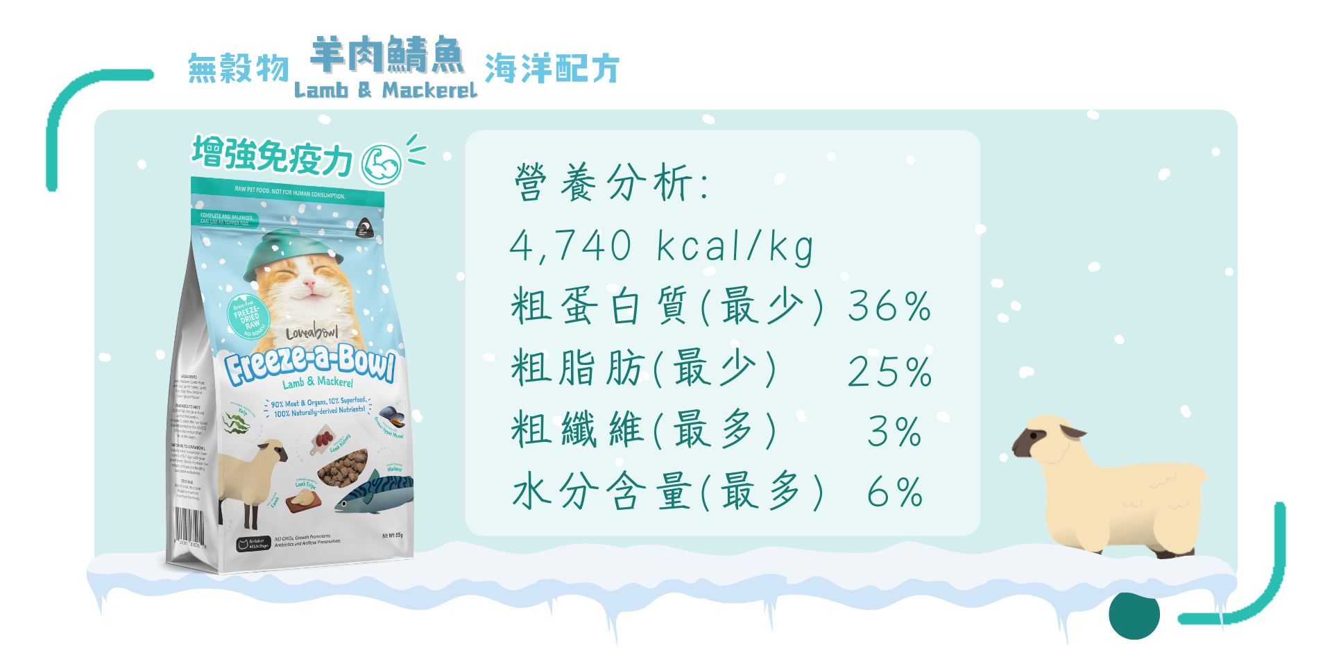 羊肉、鯖魚、羊心、羊肝、羊腎、羊肚、海帶、紐西蘭綠唇青口。