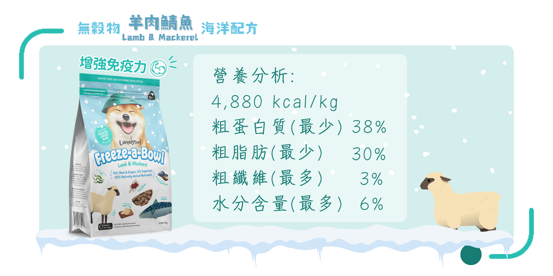 羊肉、鯖魚、羊心、羊肝、羊腎、羊肚、海帶、紐西蘭綠唇青口。
