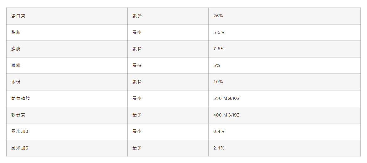 豬肉粉、 鷹嘴豆、 扁豆、 黃豌豆、 木薯、 番薯、 天然香料、 亞麻籽、 苜蓿草粉、 乾海帶、 鯡魚油、 紅蘿蔔、 歐芹、 生菜、 雞肉脂肪(不含雞肉蛋白質)、 西洋菜、 菠菜、 西芹、 氯化膽鹼、 葡萄糖氨鹽酸鹽、 軟骨膠硫酸鹽、 碳酸鈣、 磷酸二氫鈉、 乾嗜酸乳桿菌發酵物、 枯草芽孢桿菌發酵產物、 乾雙歧桿菌嗜熱發酵物、 乾長雙歧桿菌發酵物、 乾屎腸球菌發酵物、 螯合鋅蛋白、 維他命E補充劑、 硫酸鋅、 硒酵母、 硫酸亞鐵、 螯合銅蛋白、 螯合錳蛋白、 維他命A補充劑、 硫酸銅、 煙酸、 泛酸(維他命B5)、 維他命B12補充劑、 硫酸錳、 核黃素、 生物素 (維他命B7)、 維他命D3補充劑、 螯合鈷蛋白、 硫胺素硝酸鹽 (維他命B1硝酸鹽 )、 葉酸 (維他命B9)、 碘酸鈣