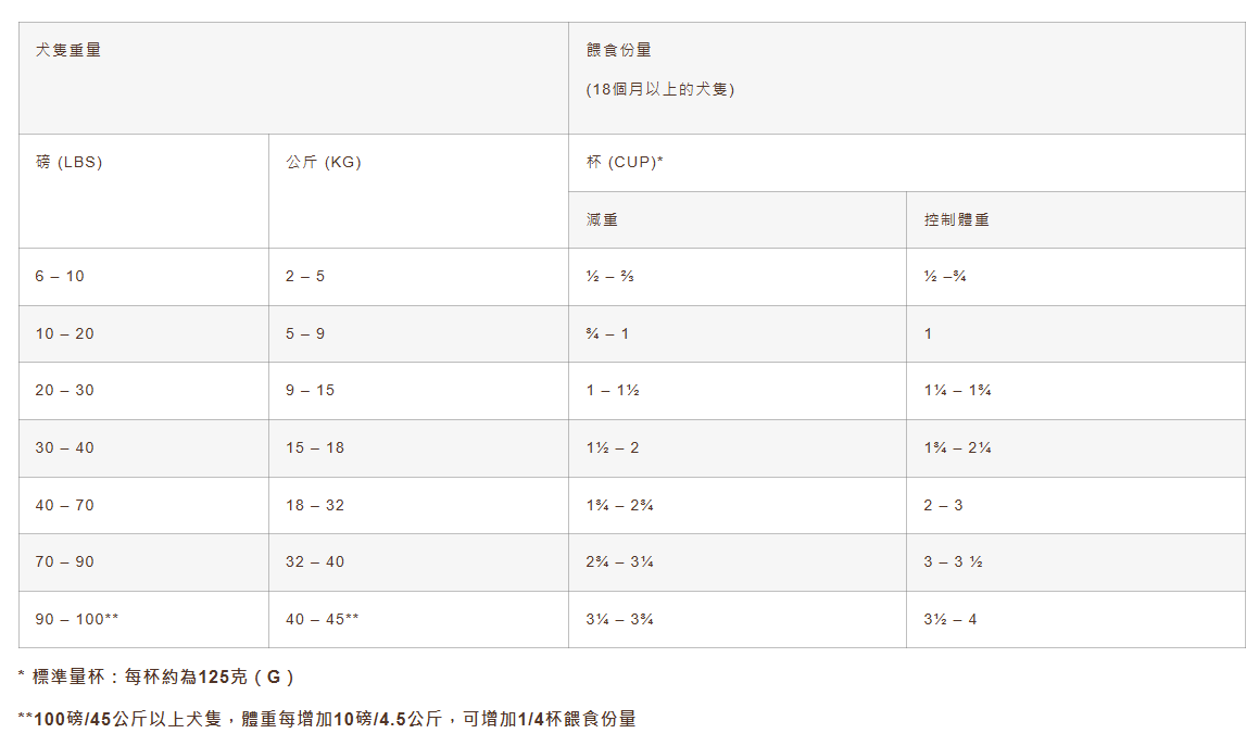成犬可根據你的喜好每天餵食一次或兩次。若犬隻每天食量超過2杯,可把份量分為2餐。由於年齡、品種、環境、活動水平和身體狀況不同,狗隻的食物需求可能跟餵養指南不同,請根據需要而調整餵食量以保持理想體重,避免過度餵食。另外,請隨時為愛寵提供新鮮及乾淨的飲用水。