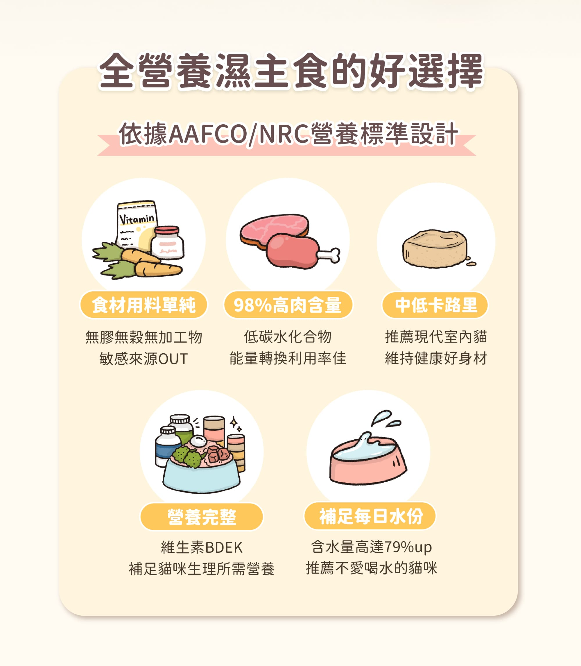 • 全營養濕主食,98% 高肉含量、低碳水化合物